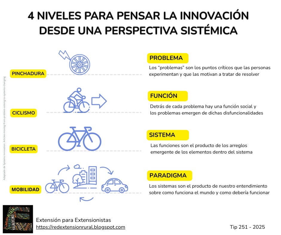 En el trabajo cotidiano de promoción de innovaciones solemos enfocarnos en resolver problemas concretos: una dificultad productiva, un cuello de botella organizativo, una necesidad urgente del territorio. Sin embargo, muchas veces esos problemas son solo la manifestación visible de sistemas que ya no están generando los resultados esperados. Este texto propone una invitación: pasar de la lógica de la resolución de problemas a una mirada sistémica de la innovación, que permita a extensionistas y facilitadores actuar como promotores de cambios más profundos y sostenibles.